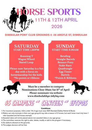Horse Sports April Flyer - click here to see our flyer.   Nominations cover events on both days. We understand that some people won't be there for both days - thats ok, nominations remain same. Events on Saturday are not compeitive - there is no prize money, points or ribbons. Sunday is for competition. $5 camping fee per family - for those staying on Saturday night. Nominations close 10am Saturday 11 April. Canteen is open Saturday night and all day Sunday. We are looking forward to seeing you there.   Saturday Events start at 1.30pm: Running T, Wagon Wheel, Barrel Loop.    Sunday Events start at 8am: Bending Race, Straight Barrels, Bounce Pony Stake Race, Quadrangle, Egg Timer Barrel Race